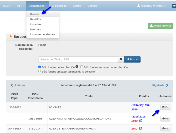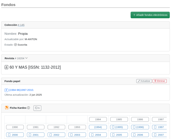 - Información de los fondos asociados a la revista. En este apartado se incluyen dos botones que permiten actualizar o eliminar los fondos existentes.
