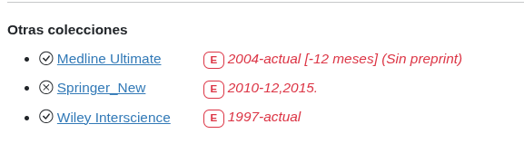 - Información de la colección, donde se indica la colección a la que pertenece la revista que se está actualizando. En el caso de que la revista esté en más de una colección, la podremos ver también en este apartado. Indicando si la tenemos o no suscrita, reflejado con un tick o con aspa.